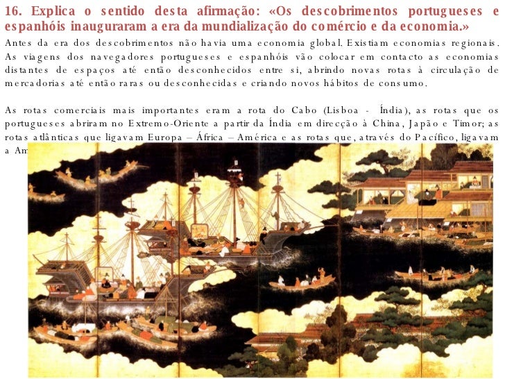 27. 27. 16. Explica o sentido desta afirmação: «Os descobrimentos portugueses e espanhóis inauguraram a era da mundialização do comércio e da economia.» Antes da era dos descobrimentos não havia uma economia global. Existiam economias regionais. As viagens dos navegadores portugueses e espanhóis vão colocar em contacto as economias distantes de espaços até então desconhecidos entre si, abrindo novas rotas à circulação de mercadorias até então raras ou desconhecidas e criando novos hábitos de consumo. As rotas comerciais mais importantes eram a rota do Cabo (Lisboa - Índia), as rotas que os portugueses abriram no Extremo-Oriente a partir da Índia em direcção à China, Japão e Timor; as rotas atlânticas que ligavam Europa – África – América e as rotas que, através do Pacífico, ligavam a América às Filipinas.