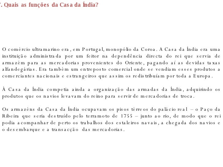 28. 28. 17. Quais as funções da Casa da Índia? O comércio ultramarino era, em Portugal, monopólio da Coroa. A Casa da Índia era uma instituição administrada por um feitor na dependência directa do rei que servia de armazém para as mercadorias provenientes do Oriente, pagando aí as devidas taxas alfandegárias. Era também um entreposto comercial onde se vendiam esses produtos a comerciantes nacionais e estrangeiros que assim os redistribuíam por toda a Europa. À Casa da Índia competia ainda a organização das armadas da Índia, adquirindo os produtos que os navios levavam do reino para servir de mercadorias de troca. Os armazéns da Casa da Índia ocupavam os pisos térreos do palácio real – o Paço da Ribeira que seria destruído pelo terramoto de 1755 – junto ao rio, de modo que o rei podia acompanhar de perto os trabalhos dos estaleiros navais, a chegada dos navios e o desembarque e a transacção das mercadorias.
