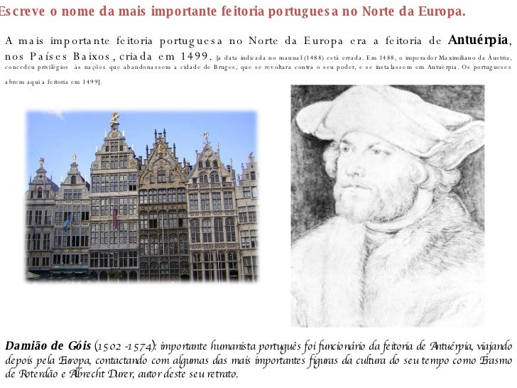 29. 29. 18. Escreve o nome da mais importante feitoria portuguesa no Norte da Europa. A mais importante feitoria portuguesa no Norte da Europa era a feitoria de Antuérpia , nos Países Baixos, criada em 1499. [a data indicada no manual (1488) está errada. Em 1488, o imperador Maximiliano da Áustria, concedeu privilégios às nações que abandonassem a cidade de Bruges, que se revoltara contra o seu poder, e se instalassem em Antuérpia. Os portugueses abrem aqui a feitoria em 1499]. Damião de Góis (1502 -1574): importante humanista português foi funcionário da feitoria de Antuérpia, viajando depois pela Europa, contactando com algumas das mais importantes figuras da cultura do seu tempo como Erasmo de Roterdão e Albrecht Durer, autor deste seu retrato.