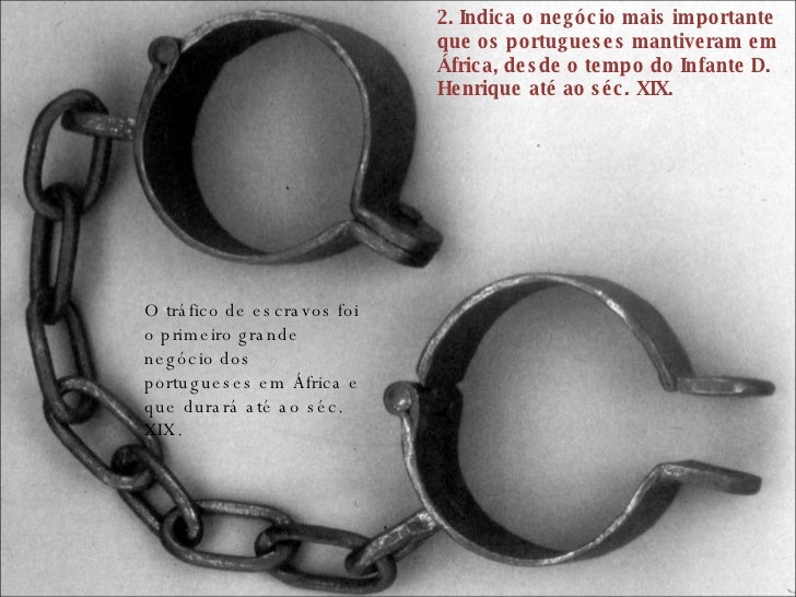 3. 3. 2. Indica o negócio mais importante que os portugueses mantiveram em África, desde o tempo do Infante D. Henrique até ao séc. XIX. O tráfico de escravos foi o primeiro grande negócio dos portugueses em África e que durará até ao séc. XIX.