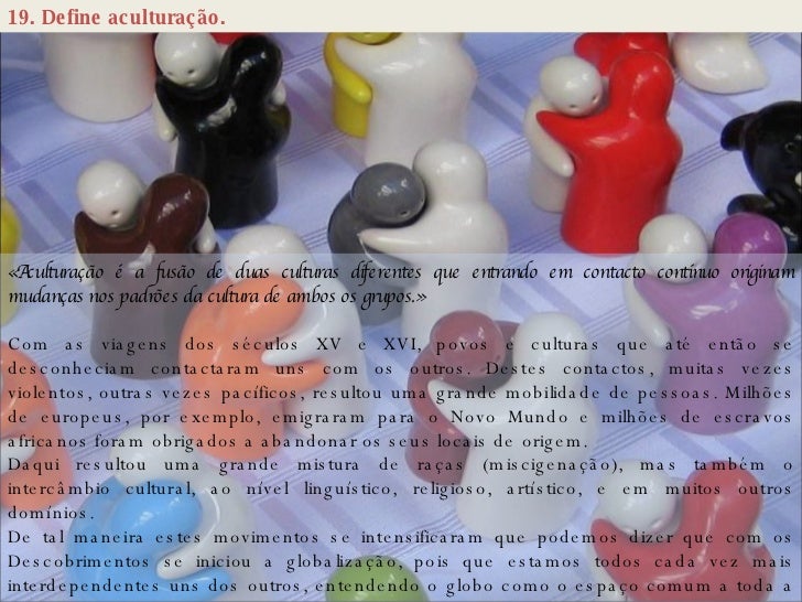 30. 30. 19. Define aculturação. «Aculturação é a fusão de duas culturas diferentes que entrando em contacto contínuo originam mudanças nos padrões da cultura de ambos os grupos.» Com as viagens dos séculos XV e XVI, povos e culturas que até então se desconheciam contactaram uns com os outros. Destes contactos, muitas vezes violentos, outras vezes pacíficos, resultou uma grande mobilidade de pessoas. Milhões de europeus, por exemplo, emigraram para o Novo Mundo e milhões de escravos africanos foram obrigados a abandonar os seus locais de origem. Daqui resultou uma grande mistura de raças (miscigenação), mas também o intercâmbio cultural, ao nível linguístico, religioso, artístico, e em muitos outros domínios. De tal maneira estes movimentos se intensificaram que podemos dizer que com os Descobrimentos se iniciou a globalização, pois que estamos todos cada vez mais interdependentes uns dos outros, entendendo o globo como o espaço comum a toda a Humanidade.