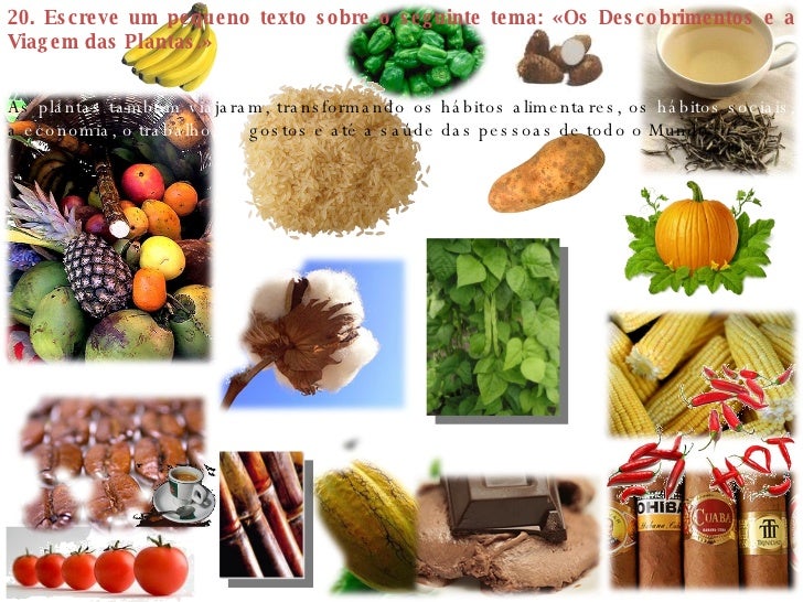 31. 31. 20. Escreve um pequeno texto sobre o seguinte tema: «Os Descobrimentos e a Viagem das Plantas.» As plantas também via jaram, transformando os hábitos alimentares, os hábitos sociais, a economia, o trabalho, os gostos e até a saúde das pessoas de todo o Mundo.