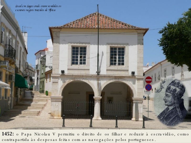 5. 5. 1452: o Papa Nicolau V permitiu o direito de os filhar e reduzir à escravidão, como contrapartida às despesas feitas com as navegações pelos portugueses. Local em Lagos onde eram vendidos os escravos negros trazidos de África