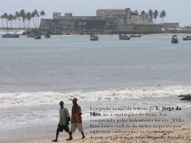 6. 6. Fotografia actual da feitoria de S. Jorge da Mina , na actual região do Gana. Foi conquistada pelos holandeses no séc. XVII e ficou como símbolo do tráfico negreiro, pois aqui eram embarcados os escravos que depois seguiam para as colónias da América e Caraíbas.