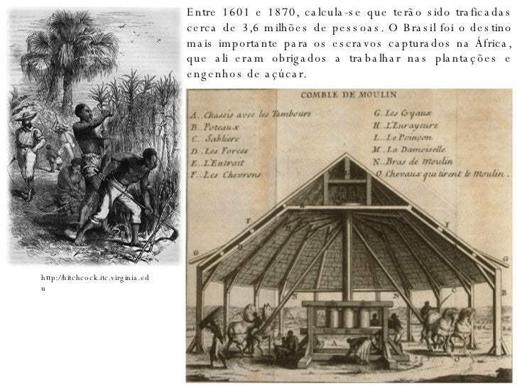 7. 7. http://hitchcock.itc.virginia.edu Entre 1601 e 1870, calcula-se que terão sido traficadas cerca de 3,6 milhões de pessoas. O Brasil foi o destino mais importante para os escravos capturados na África, que ali eram obrigados a trabalhar nas plantações e engenhos de açúcar.