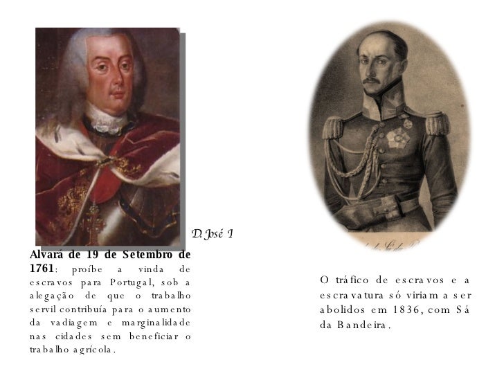 8. 8. Alvará de 19 de Setembro de 1761 : proíbe a vinda de escravos para Portugal, sob a alegação de que o trabalho servil contribuía para o aumento da vadiagem e marginalidade nas cidades sem beneficiar o trabalho agrícola. D. José I O tráfico de escravos e a escravatura só viriam a ser abolidos em 1836, com Sá da Bandeira.