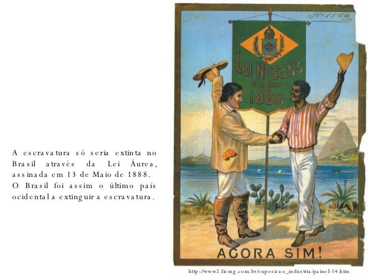 9. 9. A escravatura só seria extinta no Brasil através da Lei Áurea, assinada em 13 de Maio de 1888. O Brasil foi assim o último país ocidental a extinguir a escravatura. http://www2.fiemg.com.br/exposicao_industria/painel-14.htm