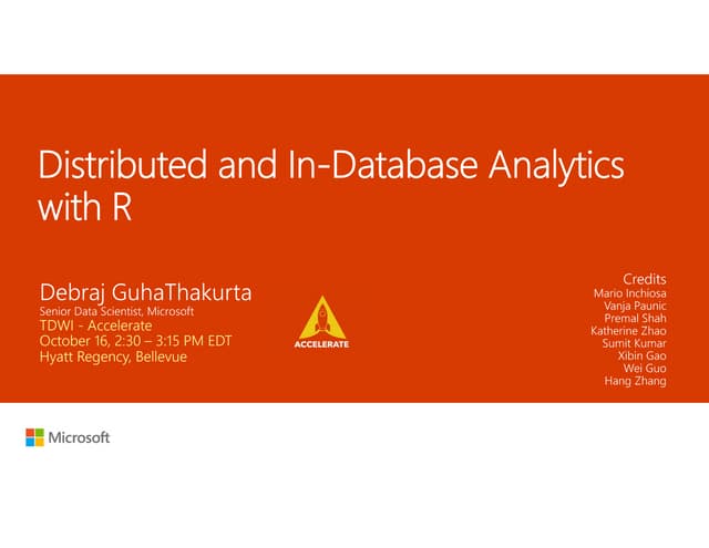 11. 11. 11 ICTeam S.p.A. – Presentazione della Divisione Progettazione Dplyr SQL translation:  Basic math operators: +, -, *, /, %%, ^  Math functions: abs, acos, asin, asinh, atan, atan2, ceiling, cos, cosh, exp, floor, log, log10, round, sign, sin, sinh, sqrt, tan, tanh  Logical comparisons: <, <=, !=, >=, >, ==, %in%  Boolean operations: &, &&, |, ||, !  Character functions: paste, tolower, toupper, nchar  Casting: as.double, as.integer, as.logical, as.character, as.date  Basic aggregations: mean, sum, min, max, sd, var, cor, cov, n