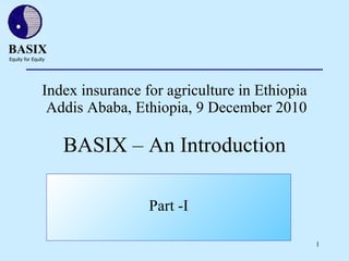 Index insurance for agriculture in Ethiopia Addis Ababa, Ethiopia, 9 December 2010 BASIX – An Introduction Part -I