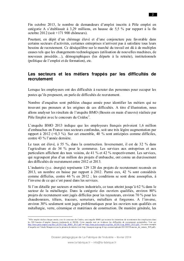 2. 2. 2 Fin octobre 2013, le nombre de demandeurs d’emploi inscrits à Pôle emploi en catégorie A s’établissait à 3,29 millions, en hausse de 5,5 % par rapport à la fin octobre 2012 (soit +171 900 chômeurs). Pourtant, en dépit d’un chômage élevé et d’une conjoncture peu favorable dans certains secteurs d’activités, certaines entreprises n’arrivent pas à satisfaire tous leurs besoins de recrutement. Ce déséquilibre sur le marché du travail est dû à de multiples causes tels que les changements technologiques (utilisation de nouvelles machines, de nouveaux procédés…), démographiques (les départs à la retraite), institutionnels (politique de l’emploi et de formation), etc. Les secteurs et les métiers frappés par les difficultés de recrutement Lorsque les employeurs ont des difficultés à recruter des personnes pour occuper les postes qu’ils proposent, on parle de difficultés de recrutement. Nombre d’enquêtes sont publiées chaque année pour identifier les métiers qui ne trouvent pas preneurs et les origines de ces difficultés. A titre d’illustration, nous allons analyser les résultats de l’enquête BMO (Besoin en main d’œuvre) réalisée par Pôle Emploi avec le concours du Crédoc1. L’enquête BMO 2013 indique que les employeurs français prévoient 1,6 million d’embauches en France tous secteurs confondus, soit une très légère augmentation par rapport à 2012 (+0,3 %). Sur cet ensemble, 40 % sont anticipées comme difficiles, contre 43 % l’année dernière. Le taux est élevé, à 55 %, dans la construction. Inversement, il est de 32 % dans l’agriculture et de 34 % pour le commerce. Les services aux entreprises et aux particuliers affichent des taux voisins, de 41 % et 42 % respectivement. Les services, qui regroupent plus d’un million des projets d’embauche, ont connu un durcissement des difficultés de recrutement entre 2012 et 2013. L’industrie (y.c. énergie) représente 129 120 des projets de recrutement recensés en 2013, un nombre en baisse par rapport à 2012. Parmi eux, 42 % sont considérés comme difficiles, contre 46 % en 2012 ; les conditions se sont donc assouplies, à l’inverse de ce qui s’est passé dans les services. Si l’on détaille par secteurs et métiers industriels, ce taux atteint jusqu’à 62 % dans le secteur de la métallurgie. Dans la catégorie des ouvriers qualifiés, environ 80% projets de recrutement sont jugés difficiles pour les tuyauteurs, environ 70 % pour les chaudronniers, tôliers, traceurs, serruriers, métalliers et forgerons. A l’inverse, environ 30% seulement sont jugés problématiques pour les ouvriers non qualifiés en métallurgie, verre, céramique et matériaux de construction. De manière générale, les 1 Pôle emploi réalise chaque année, avec le concours du Credoc, une enquête BMO qui recense les intentions de recrutement des e mployeurs dans les 388 bassins d’emploi français (métropole et DOM). Cette enquête met en évidence les difficultés de recrutement potentielles. Voir sur http://bmo.pole-emploi.org/files_dl/2013/rap_BMO_2013.pdf sur http://bmo.pole-emploi.org/files_dl/2013/rap_BMO_2013.pdf. Un autre exemple d’enquête est l’étude Manpower sur la pénurie de talents (voir http://manpowergroup.fr/wp-content/uploads/2013/05/Penuries_de_talents_WP.pdf). Dossier pédagogique de La Fabrique de l’industrie – février 2014 www.la-fabrique.fr – info@la-fabrique.fr