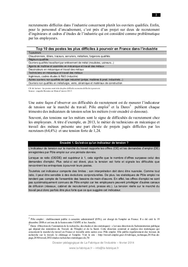 1. 1. Difficultés de recrutement et métiers en tension Le but de ce dossier pédagogique est d’expliquer les causes des difficultés de recrutement rencontrées par les industriels et d’exposer des leviers d’action possibles mis en œuvre par les acteurs publics et privés. Support pédagogique – février 2014 www.la-fabrique.fr - info@la-fabrique.fr