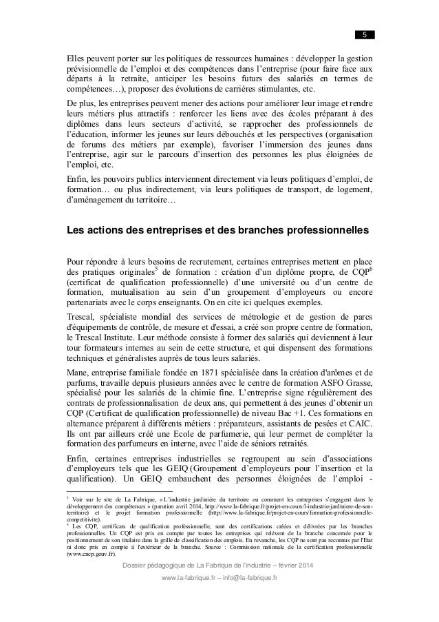 5. 5. 5 Elles peuvent porter sur les politiques de ressources humaines : développer la gestion prévisionnelle de l’emploi et des compétences dans l’entreprise (pour faire face aux départs à la retraite, anticiper les besoins futurs des salariés en termes de compétences…), proposer des évolutions de carrières stimulantes, etc. De plus, les entreprises peuvent mener des actions pour améliorer leur image et rendre leurs métiers plus attractifs : renforcer les liens avec des écoles préparant à des diplômes dans leurs secteurs d’activité, se rapprocher des professionnels de l’éducation, informer les jeunes sur leurs débouchés et les perspectives (organisation de forums des métiers par exemple), favoriser l’immersion des jeunes dans l’entreprise, agir sur le parcours d’insertion des personnes les plus éloignées de l’emploi, etc. Enfin, les pouvoirs publics interviennent directement via leurs politiques d’emploi, de formation… ou plus indirectement, via leurs politiques de transport, de logement, d’aménagement du territoire… Les actions des entreprises et des branches professionnelles Pour répondre à leurs besoins de recrutement, certaines entreprises mettent en place des pratiques originales5 de formation : création d’un diplôme propre, de CQP6 (certificat de qualification professionnelle) d’une université ou d’un centre de formation, mutualisation au sein d’un groupement d’employeurs ou encore partenariats avec le corps enseignants. On en cite ici quelques exemples. Trescal, spécialiste mondial des services de métrologie et de gestion de parcs d'équipements de contrôle, de mesure et d'essai, a créé son propre centre de formation, le Trescal Institute. Leur méthode consiste à former des salariés qui deviennent à leur tour formateurs internes au sein de cette structure, et qui dispensent des formations techniques et généralistes auprès de tous leurs salariés. Mane, entreprise familiale fondée en 1871 spécialisée dans la création d'arômes et de parfums, travaille depuis plusieurs années avec le centre de formation ASFO Grasse, spécialisé pour les salariés de la chimie fine. L’entreprise signe régulièrement des contrats de professionnalisation de deux ans, qui permettent à des jeunes d’obtenir un CQP (Certificat de qualification professionnelle) de niveau Bac +1. Ces formations en alternance préparent à différents métiers : préparateurs, assistants de pesées et CAIC. Ils ont par ailleurs créé une Ecole de parfumerie, qui leur permet de compléter la formation des parfumeurs en interne, avec l’aide de séniors retraités. Enfin, certaines entreprises industrielles se regroupent au sein d’associations d’employeurs tels que les GEIQ (Groupement d’employeurs pour l’insertion et la qualification). Un GEIQ embauchent des personnes éloignées de l’emploi 5 Voir sur le site de La Fabrique, « L’industrie jardinière du territoire ou comment les entreprises s’engagent dans le développement des compétences » (parution avril 2014, http://www.la-fabrique.fr/projet-en-cours/l-industrie-jardiniere-de-sonterritoire) et le projet formation professionnelle (http://www.la-fabrique.fr/projet-en-cours/formation-professionnellecompetitivite). 6 Les CQP, certificats de qualification professionnelle, sont des certifications créées et délivrées par les branches professionnelles. Un CQP est pris en compte par toutes les entreprises qui relèvent de la branche concernée pour le positionnement de son titulaire dans la grille de classification des emplois. En revanche, les CQP ne sont pas reconnus par l'Etat ni donc pris en compte à l'extérieur de la branche. Source : Commission nationale de la certification professionnelle (www.cncp.gouv.fr). Dossier pédagogique de La Fabrique de l’industrie – février 2014 www.la-fabrique.fr – info@la-fabrique.fr