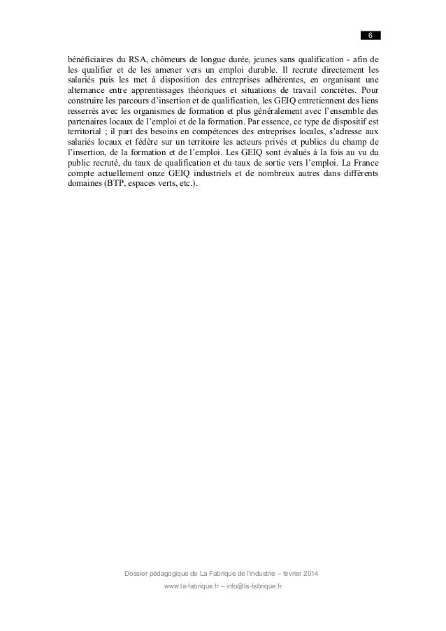 6. 6. 6 bénéficiaires du RSA, chômeurs de longue durée, jeunes sans qualification - afin de les qualifier et de les amener vers un emploi durable. Il recrute directement les salariés puis les met à disposition des entreprises adhérentes, en organisant une alternance entre apprentissages théoriques et situations de travail concrètes. Pour construire les parcours d’insertion et de qualification, les GEIQ entretiennent des liens resserrés avec les organismes de formation et plus généralement avec l’ensemble des partenaires locaux de l’emploi et de la formation. Par essence, ce type de dispositif est territorial ; il part des besoins en compétences des entreprises locales, s’adresse aux salariés locaux et fédère sur un territoire les acteurs privés et publics du champ de l’insertion, de la formation et de l’emploi. Les GEIQ sont évalués à la fois au vu du public recruté, du taux de qualification et du taux de sortie vers l’emploi. La France compte actuellement onze GEIQ industriels et de nombreux autres dans différents domaines (BTP, espaces verts, etc.). Dossier pédagogique de La Fabrique de l’industrie – février 2014 www.la-fabrique.fr – info@la-fabrique.fr