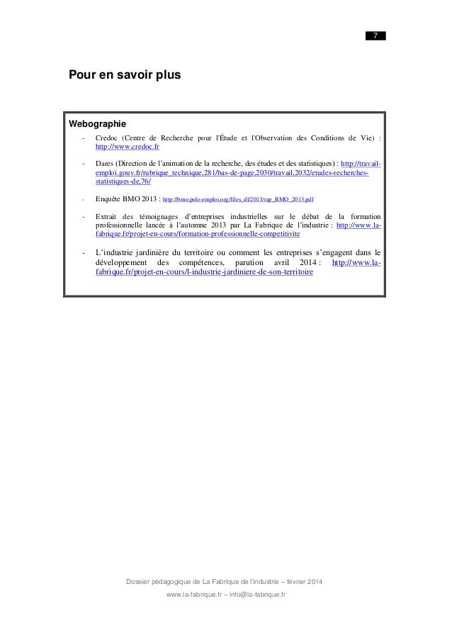 7. 7. 7 Pour en savoir plus Webographie - Credoc (Centre de Recherche pour l'Étude et l'Observation des Conditions de Vie) : http://www.credoc.fr - Dares (Direction de l’animation de la recherche, des études et des statistiques) : http://travailemploi.gouv.fr/rubrique_technique,281/bas-de-page,2030/travail,2032/etudes-recherchesstatistiques-de,76/ - Enquête BMO 2013 : http://bmo.pole-emploi.org/files_dl/2013/rap_BMO_2013.pdf - Extrait des témoignages d’entreprises industrielles sur le débat de la formation professionnelle lancée à l’automne 2013 par La Fabrique de l’industrie : http://www.lafabrique.fr/projet-en-cours/formation-professionnelle-competitivite - L’industrie jardinière du territoire ou comment les entreprises s’engagent dans le développement des compétences, parution avril 2014 : http://www.lafabrique.fr/projet-en-cours/l-industrie-jardiniere-de-son-territoire Dossier pédagogique de La Fabrique de l’industrie – février 2014 www.la-fabrique.fr – info@la-fabrique.fr