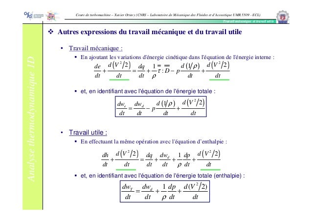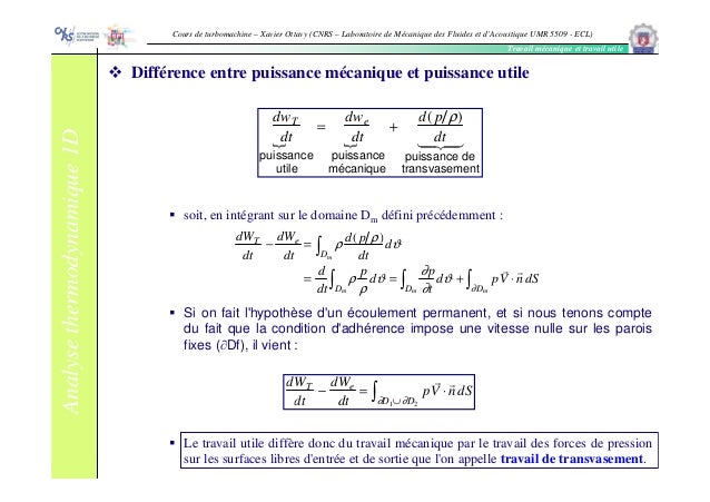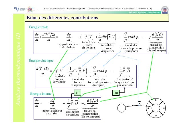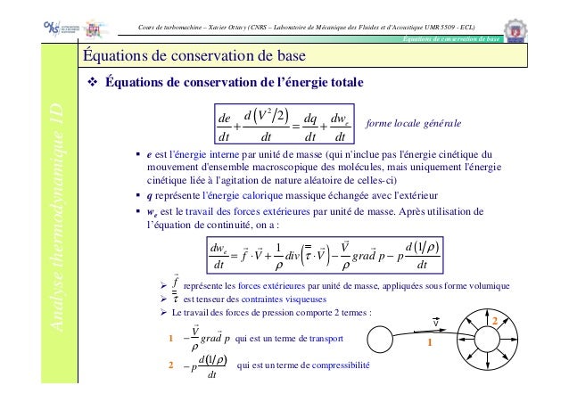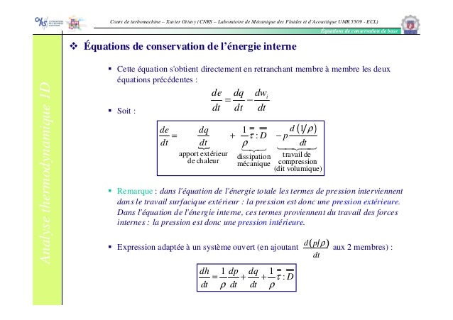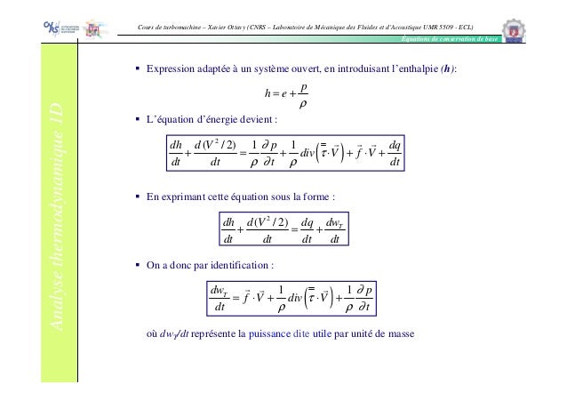 26. 26. Cours de turbomachine – Xavier Ottavy (CNRS – Laboratoire de Mécanique des Fluides et d’Acoustique UMR 5509 - ECL) Analysethermodynamique1D Équations de conservation de l’énergie interne Cette équation s'obtient directement en retranchant membre à membre les deux équations précédentes : Soit : Remarque : dans l'équation de l'énergie totale les termes de pression interviennent dans le travail surfacique extérieur : la pression est donc une pression extérieure. Dans l'équation de l'énergie interne, ces termes proviennent du travail des forces internes : la pression est donc une pression intérieure. Expression adaptée à un système ouvert (en ajoutant aux 2 membres) : idwde dq dt dt dt = − { ( ) apport extérieur travail dedissipation de chaleur compressionmécanique (dit volumique) 11 : dde dq D p dt dt dt ρ τ ρ = + − 14243123 Équations de conservation de base d p ρ( ) dt 1 1 : dh dp dq D dt dt dt τ ρ ρ = + +