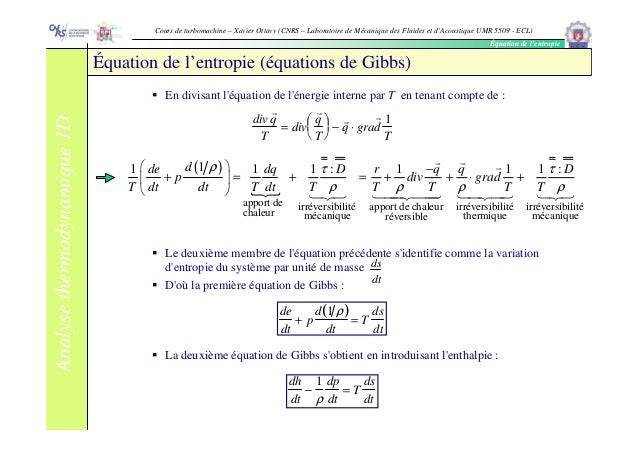 28. 28. Cours de turbomachine – Xavier Ottavy (CNRS – Laboratoire de Mécanique des Fluides et d’Acoustique UMR 5509 - ECL) Équation de l’entropie (équations de Gibbs)Analysethermodynamique1D Équation de l’entropie En divisant l'équation de l'énergie interne par T en tenant compte de : Le deuxième membre de l'équation précédente s'identifie comme la variation d'entropie du système par unité de masse D'où la première équation de Gibbs : La deuxième équation de Gibbs s'obtient en introduisant l'enthalpie : div r q T = div r q T       − r q ⋅ gra r d 1 T ( ) { apport de irréversibilité apport de chaleur irréversibilité irréversibilité chaleur mécanique thermique mécaniqueréversible 11 1 1 : 1 1 1 :dde dq D r q q D p div grad T dt dt T dt T T T T T ρ τ τ ρ ρ ρ ρ   − + = + = + + ⋅ +    r r r 123 1442443 14243 123 de dt + p d 1 ρ( ) dt = T ds dt dh dt − 1 ρ dp dt = T ds dt ds dt