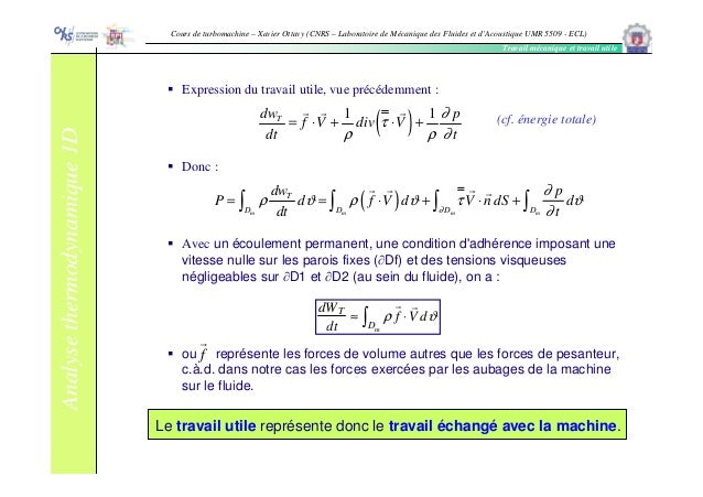 30. 30. Cours de turbomachine – Xavier Ottavy (CNRS – Laboratoire de Mécanique des Fluides et d’Acoustique UMR 5509 - ECL) Expression du travail utile, vue précédemment : Donc : Avec un écoulement permanent, une condition d'adhérence imposant une vitesse nulle sur les parois fixes (∂Df) et des tensions visqueuses négligeables sur ∂D1 et ∂D2 (au sein du fluide), on a : ou représente les forces de volume autres que les forces de pesanteur, c.à.d. dans notre cas les forces exercées par les aubages de la machine sur le fluide. Le travail utile représente donc le travail échangé avec la machine. Analysethermodynamique1D Travail mécanique et travail utile ( )m m m m T D D D D dw p P d f V d V n dS d dt t∂ ∂ ρ ϑ ρ ϑ τ ϑ ∂ = = ⋅ + ⋅ +∫ ∫ ∫ ∫ r r r r ( )1 1Tdw p f V div V dt t ∂ τ ρ ρ ∂ = ⋅ + ⋅ + r r r dWT dt ≈ ρ r f ⋅ r V dϑ Dm ∫ r f (cf. énergie totale)