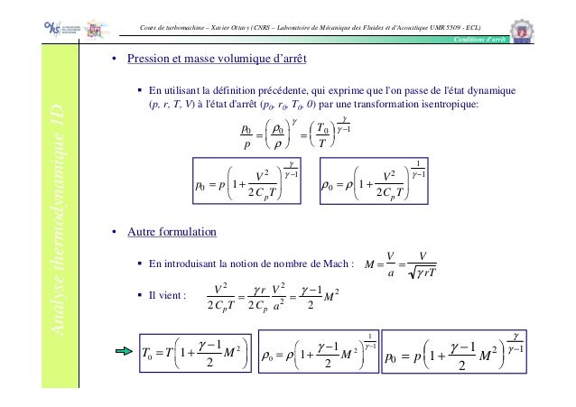 39. 39. Cours de turbomachine – Xavier Ottavy (CNRS – Laboratoire de Mécanique des Fluides et d’Acoustique UMR 5509 - ECL) Équation thermique d’état • Pour un gaz parfait, la définition des variables d'arrêt entraîne : • Ce résultat est évident si on considère que l'état d'arrêt (même s'il est fictif) est un état au sens thermodynamique : les variables y caractérisant le fluide sont donc régies par l'équation thermique d'état. Analysethermodynamique1D Conditions d’arrêt p = ρ rT = ρ0 1+ γ − 1 2 M2      1 1−γ ⋅r ⋅ T0 1+ γ −1 2 M 2      −1 = ρ0 rT0 1+ γ −1 2 M2      γ 1−γ p0 = ρ0 rT0