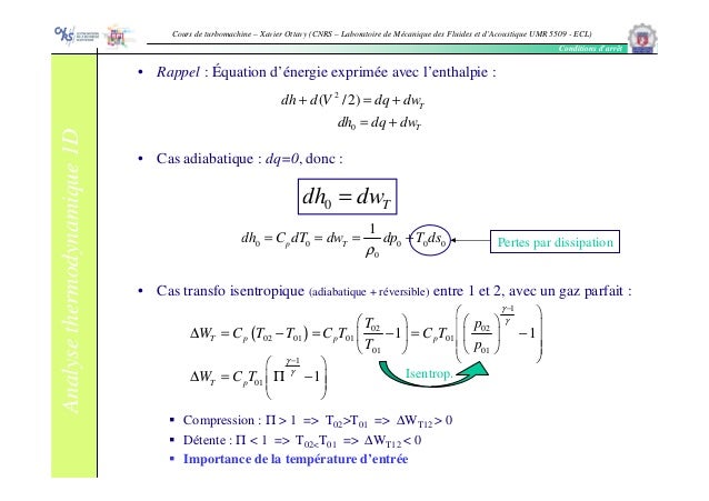 41. 41. Cours de turbomachine – Xavier Ottavy (CNRS – Laboratoire de Mécanique des Fluides et d’Acoustique UMR 5509 - ECL) • Rappel : Équation d’énergie exprimée avec l’enthalpie : • Cas adiabatique : dq=0, donc : • Cas transfo isentropique (adiabatique + réversible) entre 1 et 2, avec un gaz parfait : Compression : Π > 1 => T02>T01 => ∆WT12 > 0 Détente : Π < 1 => T02<T01 => ∆WT12 < 0 Importance de la température d’entrée Analysethermodynamique1D Conditions d’arrêt 2 ( / 2) Tdh d V dq dw+ = + 0 Tdh dw= 0 Tdh dq dw= + 0 0 0 0 0 0 1 p Tdh C dT dw dp T ds ρ = = = + Pertes par dissipation ( ) 1 02 02 02 01 01 01 01 01 1 1T p p p T p W C T T C T C T T p γ γ −       ∆ = − = − = −           1 01 1T pW C T γ γ −   ∆ = Π −     Isentrop.