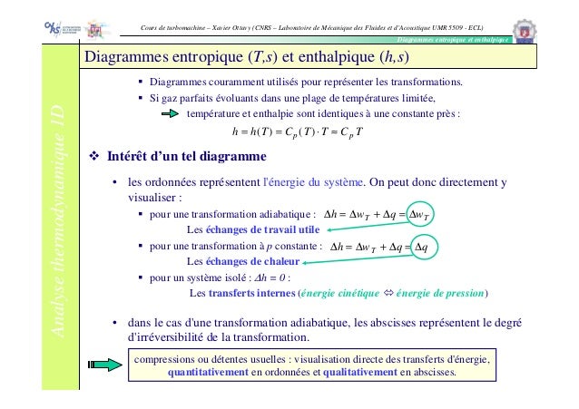 43. 43. Cours de turbomachine – Xavier Ottavy (CNRS – Laboratoire de Mécanique des Fluides et d’Acoustique UMR 5509 - ECL) Quelques iso-valeurs intéressantes • Isentropiques : les compressions et détentes usuelles réversibles sont représentées par des droites verticales. • Adiabatiques irréversibles : selon le second principe ∆wd > 0, que ce soient des compressions ou des détentes, l'entropie augmente. • Isothermes (ou isenthalpiques) : ce sont des droites horizontales. • Isobares (cas des apports de chaleur usuels) : Après intégration de l’équation de Gibbs, on montre que les isobares sont des exponentielles croissantes se déduisant l'une de l'autre par translation horizontale. Remarques : l'écart vertical entre deux isobares augmente avec la température : ce résultat est déterminant pour comprendre le fonctionnement d'une turbine à gaz. dans le cas d'un gaz non parfait, il est indispensable d'utiliser le diagramme enthalpique, où toutes ces courbes sont distordues. ex : vapeur d'eau utilisée dans les turbines à vapeur (le diagramme enthalpique correspondant est le diagramme de Mollier). Analysethermodynamique1D Diagrammes entropique et enthalpique