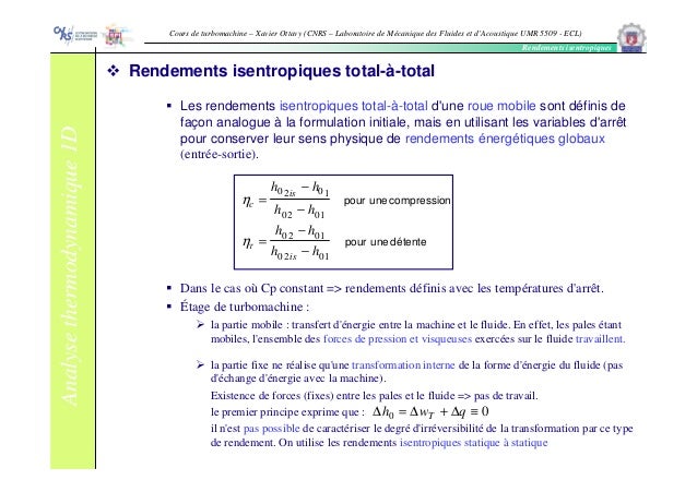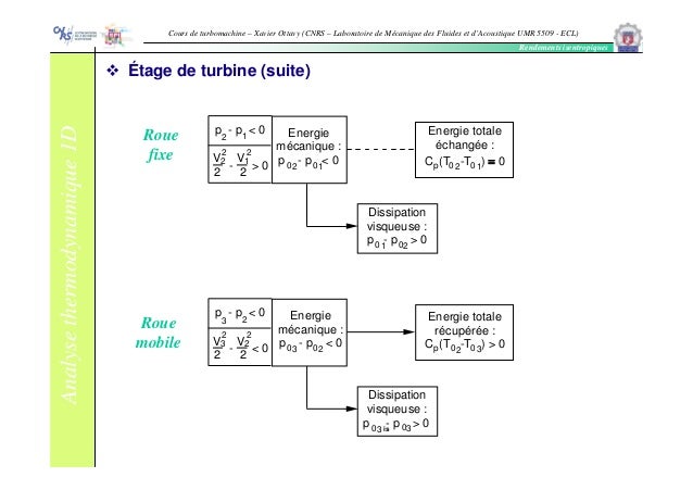 49. 49. Cours de turbomachine – Xavier Ottavy (CNRS – Laboratoire de Mécanique des Fluides et d’Acoustique UMR 5509 - ECL) Étage de turbine (suite)Analysethermodynamique1D Rendements isentropiques Energie totale échangée : C (T -T ) ≡≡≡≡ 0p 0 12 0 Dissipation visqueuse : p - p > 000 21 Energie mécanique : p - p < 002 01 V V > 01 2 2 2 2 2 - p - p < 0 2 1 Energie totale récupérée : C (T -T ) > 0p 0 32 0 Dissipation visqueuse : p - p > 000 33 Energie mécanique : p - p < 003 02 V V < 02 2 3 2 2 2 - p - p < 0 3 2 is Roue mobile Roue fixe