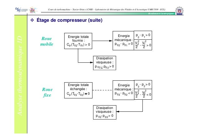 47. 47. Cours de turbomachine – Xavier Ottavy (CNRS – Laboratoire de Mécanique des Fluides et d’Acoustique UMR 5509 - ECL) Étage de compresseur (suite)Analysethermodynamique1D Rendements isentropiques Energie totale fournie : C (T -T ) > 0p 0 12 0 0 Energie mécanique : p - p > 00 12 Dissipation visqueuse : p - p > 000 22 is V V > 01 2 2 2 2 2 - p - p > 0 2 1 Energie totale échangée : C (T -T ) ≡≡≡≡ 0p 0 23 0 0 Energie mécanique : p - p < 00 23 Dissipation visqueuse : p - p > 000 32 V V < 02 2 3 2 2 2 - p - p > 0 3 2 Roue mobile Roue fixe