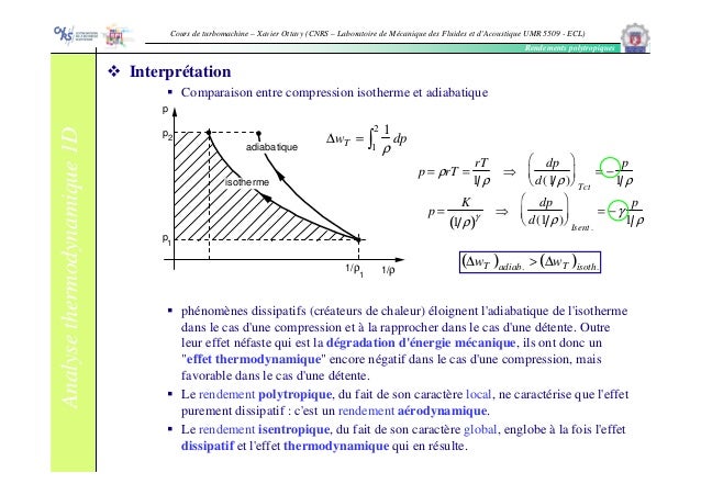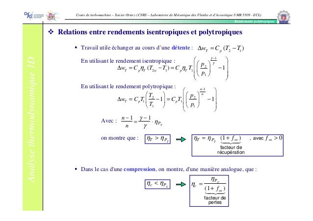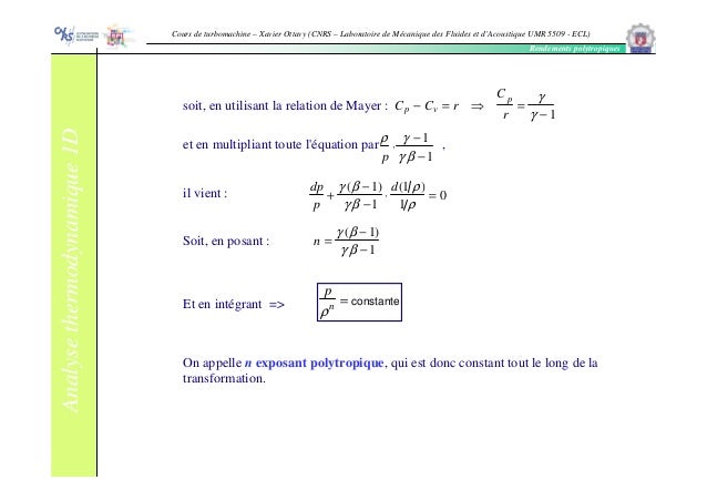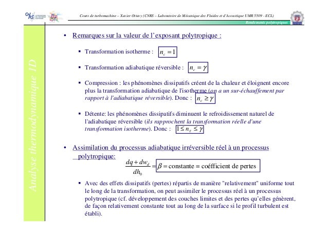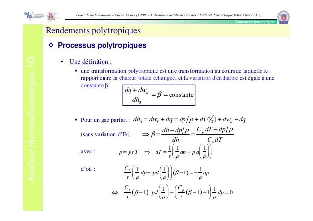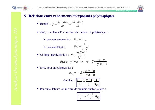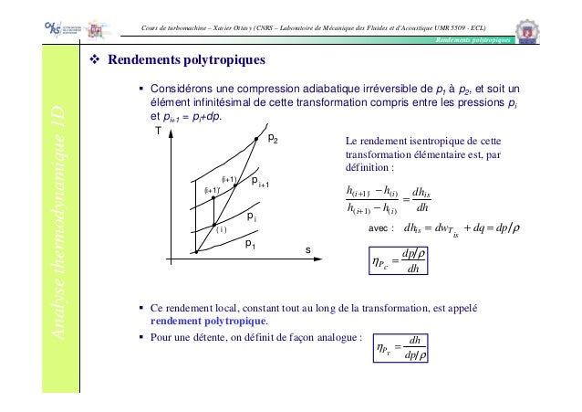 50. 50. Cours de turbomachine – Xavier Ottavy (CNRS – Laboratoire de Mécanique des Fluides et d’Acoustique UMR 5509 - ECL) Rendements polytropiques Processus polytropiques • Une définition : une transformation polytropique est une transformation au cours de laquelle le rapport entre la chaleur totale échangée, et la variation d'enthalpie est égale à une constante β. Pour un gaz parfait : (sans variation d’Ec) avec : d’où : Analysethermodynamique1D Rendements polytropiques 0 constanteddq dw dh β + = = 2 20 ( )V T d p p dh dw dq dp d dw dq C dT dpdh dp dh C dT ρ ρρ β = + = + + + −− ⇒ = = p = ρ rT ⇒ dT = 1 r 1 ρ dp + pd 1 ρ             Cp r 1 ρ dp+ pd 1 ρ             β −1( )= − 1 ρ dp ⇔ Cp r β − 1( )⋅ pd 1 ρ       + Cp r β − 1( )+1       1 ρ dp = 0