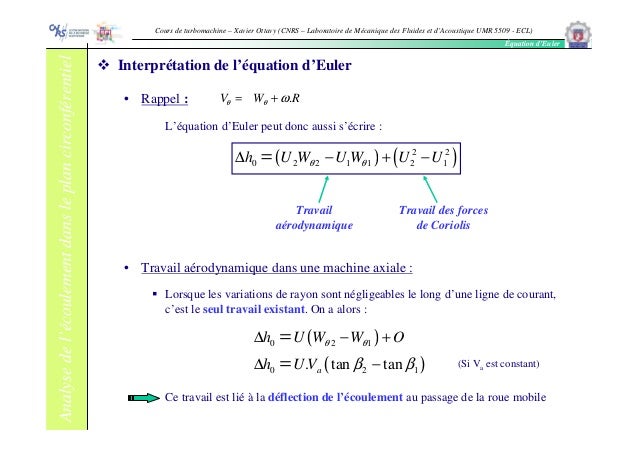 69. 69. Cours de turbomachine – Xavier Ottavy (CNRS – Laboratoire de Mécanique des Fluides et d’Acoustique UMR 5509 - ECL) Équation d’Euler Interprétation de l’équation d’Euler • Rappel : L’équation d’Euler peut donc aussi s’écrire : • Travail aérodynamique dans une machine axiale : Lorsque les variations de rayon sont négligeables le long d’une ligne de courant, c’est le seul travail existant. On a alors : Ce travail est lié à la déflection de l’écoulement au passage de la roue mobile Analysedel’écoulementdansleplancirconférentiel ( ) ( ) 0 2 1 0 2 1. tan tana h U W W O h U V θ θ β β ∆ − + ∆ − = = .V W Rθ θ ω= + Travail aérodynamique Travail des forces de Coriolis ( ) ( )2 2 0 2 2 1 1 2 1h U W U W U Uθ θ∆ − + −= (Si Va est constant)