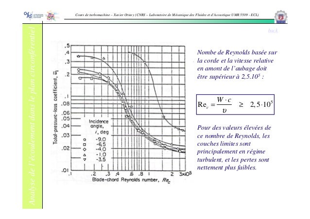 76. 76. Cours de turbomachine – Xavier Ottavy (CNRS – Laboratoire de Mécanique des Fluides et d’Acoustique UMR 5509 - ECL) back Analysedel’écoulementdansleplancirconférentiel Nombe de Reynolds basée sur la corde et la vitesse relative en amont de l’aubage doit être supérieur à 2,5.105 : 5 Re 2,5 10c W c υ ⋅ = ≥ ⋅ Pour des valeurs élevées de ce nombre de Reynolds, les couches limites sont principalement en régime turbulent, et les pertes sont nettement plus faibles.