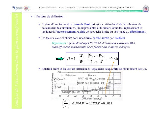 79. 79. Cours de turbomachine – Xavier Ottavy (CNRS – Laboratoire de Mécanique des Fluides et d’Acoustique UMR 5509 - ECL) Écoulement en grille d’aubes de compresseur • Facteur de diffusion : Il vient d’une forme du critère de Buri qui est un critère local de décollement de couches limites turbulentes, incompressibles et bidimensionnelles, représentant la tendance à l’accroissement rapide de la couche limite au voisinage du décollement. Ce facteur a été explicité sous une forme entrée-sortie par Lieblein Hypothèses : grille d’aubages NACA 65 d’épaisseur maximum 10%, mais efficacité satisfaisante de ce facteur sur d’autres aubages. Relation entre le facteur de diffusion et l’épaisseur de quantité de mouvement des CL Analysedel’écoulementdansleplancirconférentiel 2 12 1 1 1 0.6 2 W WW D W W θ θ σ − = − + ≤ ⋅ ⋅ * 2 0.0804. 0.0272. 0.0071D D c θ  ≈ − +   