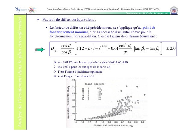 80. 80. Cours de turbomachine – Xavier Ottavy (CNRS – Laboratoire de Mécanique des Fluides et d’Acoustique UMR 5509 - ECL) Écoulement en grille d’aubes de compresseur • Facteur de diffusion équivalent : Le facteur de diffusion cité précédemment ne s’applique qu’au point de fonctionnement nominal, d’où la nécessité d’un autre critère pour le fonctionnement hors adaptation. C’est le facteur de diffusion équivalent : a = 0.0117 pour les aubages de la série NACA 65 A10 a = 0.007 pour les aubages de la série C4 i* est l’angle d’incidence optimum i est l’angle d’incidence réel Analysedel’écoulementdansleplancirconférentiel 2 1.43*2 1 2 1 1 cos cos 1.12 0.61 tan tan 2.0 cos eqD a i i β β β β β σ   = ⋅ + ⋅ − + ⋅ − ≤   