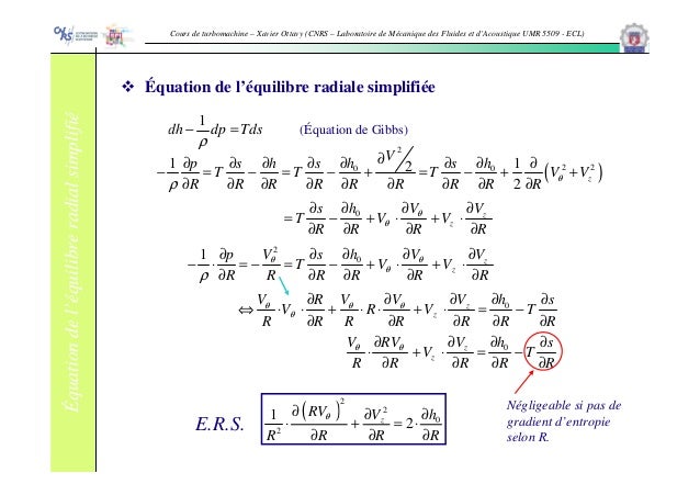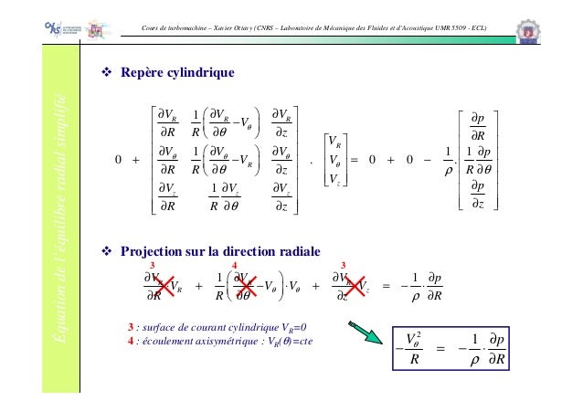 83. 83. Cours de turbomachine – Xavier Ottavy (CNRS – Laboratoire de Mécanique des Fluides et d’Acoustique UMR 5509 - ECL) Repère cylindrique Projection sur la direction radiale 1 1 1 1 0 . 0 0 . 1 R R R R R z z z z V V V pV R R z RV V V V p V V R R z R V pV V V zR R z θ θ θ θ θ θ θ ρ θ θ  ∂ ∂ ∂  ∂ −    ∂ ∂ ∂  ∂       ∂ ∂ ∂ ∂     + − = + −      ∂ ∂ ∂ ∂        ∂ ∂ ∂ ∂      ∂ ∂ ∂ ∂   3 3 : surface de courant cylindrique VR=0 4 : écoulement axisymétrique : VR(θ)=cte 34 1 1R R R R z V V V p V V V V R R z R θ θ θ ρ ∂ ∂ ∂ ∂  ⋅ + − ⋅ + ⋅ = − ⋅  ∂ ∂ ∂ ∂  2 1V p R R θ ρ ∂ − = − ⋅ ∂ Équationdel’équilibreradialsimplifié