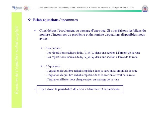 85. 85. Cours de turbomachine – Xavier Ottavy (CNRS – Laboratoire de Mécanique des Fluides et d’Acoustique UMR 5509 - ECL) Bilan équations / inconnues • Considérons l'écoulement au passage d'une roue. Si nous faisons les bilans du nombre d'inconnues du problème et du nombre d'équations disponibles, nous avons : 6 inconnues : - les répartitions radiales de h0, Vz et Vθ dans une section à l'amont de la roue - les répartitions radiales de h0, Vz et Vθ dans une section à l'aval de la roue 3 équations : - l'équation d'équilibre radial simplifiée dans la section à l'amont de la roue - l'équation d'équilibre radial simplifiée dans la section à l'aval de la roue - l'équation d'Euler pour chaque rayon au passage de la roue • Il y a donc la possibilité de choisir librement 3 répartitions. Équationdel’équilibreradialsimplifié