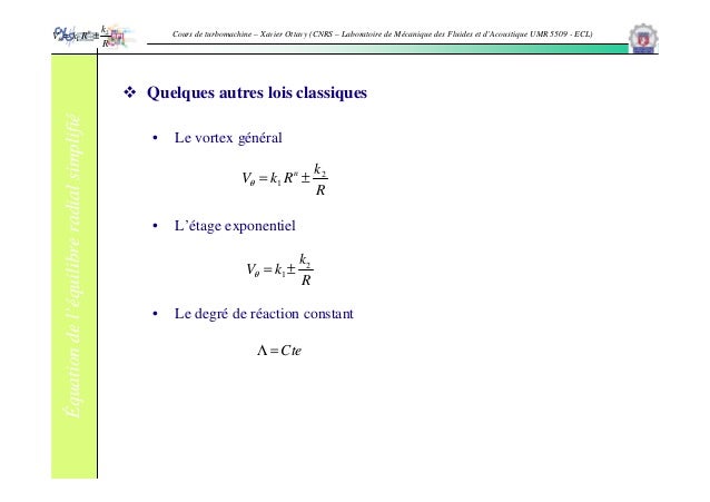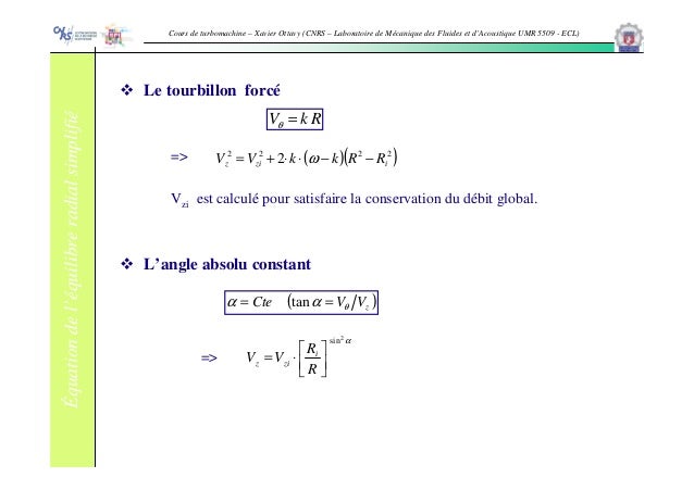 87. 87. Cours de turbomachine – Xavier Ottavy (CNRS – Laboratoire de Mécanique des Fluides et d’Acoustique UMR 5509 - ECL) Le tourbillon forcé => Vzi est calculé pour satisfaire la conservation du débit global. L’angle absolu constant => Équationdel’équilibreradialsimplifié Vθ = k R ( )( )2222 2 iziz RRkkVV −−⋅⋅+= ω ( )zVVCte θαα == tan α2 sin     ⋅= R R VV i ziz