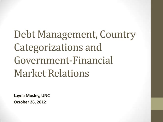 4. 4. Factors influencing debt sustainability Macro factors  r-g over a very long period  Optimal debt level Willingness to pay  Tax pressure, tax evasion, efficiency of the public sector, perceived equity  Debt ownership Currency  Foreign currency debt more likely to be restructured, other things equal  Domestic currency: risk of monetization? Off-balance sheet liabilities  Ageing  Too-big-to-fail banks Government assets (?) Liquidity  Debt level + average maturity  Gross financing needs