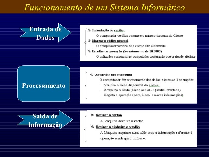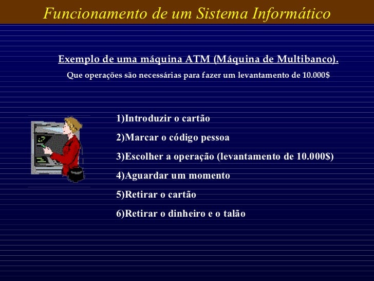 10. 10. Exemplo de uma máquina ATM (Máquina de Multibanco). Que operações são necessárias para fazer um levantamento de 10.000$ <ul><li>Introduzir o cartão </li></ul><ul><li>Marcar o código pessoa </li></ul><ul><li>Escolher a operação (levantamento de 10.000$) </li></ul><ul><li>Aguardar um momento </li></ul><ul><li>Retirar o cartão </li></ul><ul><li>Retirar o dinheiro e o talão </li></ul>Funcionamento de um Sistema Informático