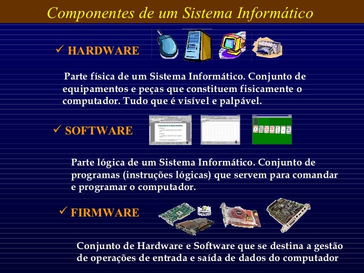 12. 12.   Parte física de um Sistema Informático. Conjunto de equipamentos e peças que constituem fisicamente o computador. Tudo que é visível e palpável. Componentes de um Sistema Informático Parte lógica de um Sistema Informático. Conjunto de programas (instruções lógicas) que servem para comandar e programar o computador. <ul><li>HARDWARE </li></ul><ul><li>SOFTWARE </li></ul><ul><li>FIRMWARE </li></ul>Conjunto de Hardware e Software que se destina a gestão de operações de entrada e saída de dados do computador