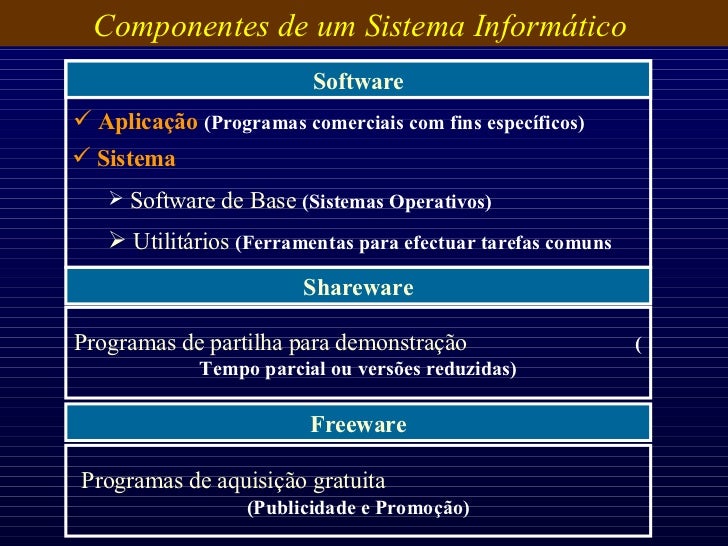13. 13. Componentes de um Sistema Informático Software Shareware Programas de partilha para demonstração ( Tempo parcial ou versões reduzidas) Freeware Programas de aquisição gratuita (Publicidade e Promoção) <ul><li>Aplicação (Programas comerciais com fins específicos) </li></ul><ul><li>Sistema </li></ul><ul><ul><li>Software de Base (Sistemas Operativos) </li></ul></ul><ul><ul><li>Utilitários (Ferramentas para efectuar tarefas comuns </li></ul></ul>