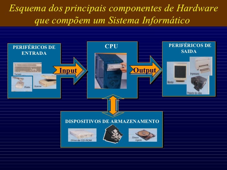 14. 14. Esquema dos principais componentes de Hardware que compõem um Sistema Informático CPU Output PERIFÉRICOS DE SAIDA PERIFÉRICOS DE ENTRADA Input DISPOSITIVOS DE ARMAZENAMENTO