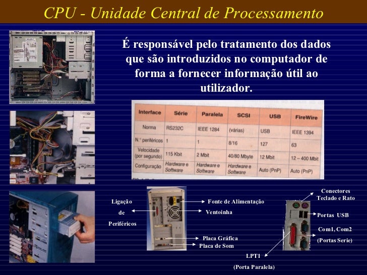 15. 15. É responsável pelo tratamento dos dados que são introduzidos no computador de forma a fornecer informação útil ao utilizador. CPU - Unidade Central de Processamento Tipo de Caixa Tower Mini-Tower Desktop Fonte de Alimentação Ventoinha Ligação de Periféricos Placa Gráfica Placa de Som LPT1 (Porta Paralela) Com1, Com2 (Portas Serie) Portas USB Conectores Teclado e Rato