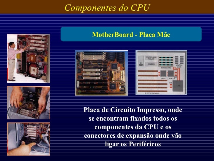 16. 16. Componentes do CPU MotherBoard - Placa Mãe Placa de Circuito Impresso, onde se encontram fixados todos os componentes da CPU e os conectores de expansão onde vão ligar os Periféricos
