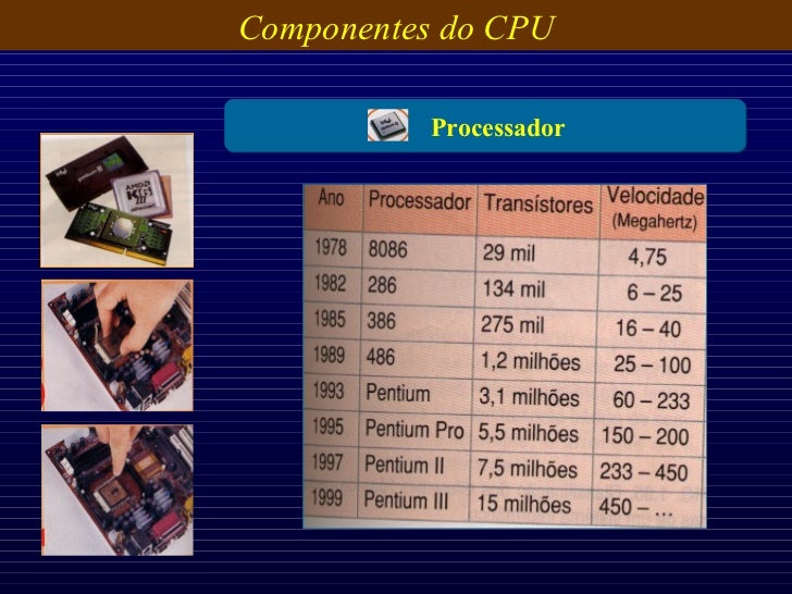 17. 17. Componentes do CPU É o “coração” de todo o sistema. É onde se executam a maior parte das operações de Processamento. A sua velocidade é medida em (MHz  milhão de instruções por segundo) Marcas : Intel, AMD, Cyrix ... Gerações : 286, 386, 486, Pentium... Velocidades Actuais : 1Ghz-2,5Ghz Processador