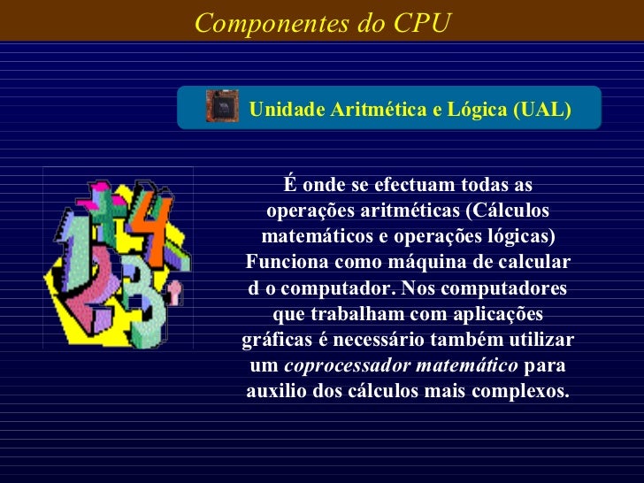18. 18. Componentes do CPU É onde se efectuam todas as operações aritméticas (Cálculos matemáticos e operações lógicas) Funciona como máquina de calcular d o computador. Nos computadores que trabalham com aplicações gráficas é necessário também utilizar um coprocessador matemático para auxilio dos cálculos mais complexos. Unidade Aritmética e Lógica (UAL)