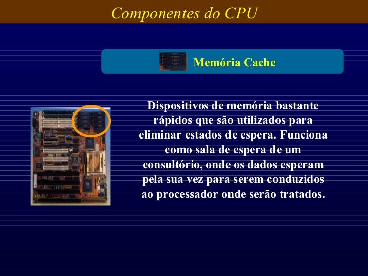 19. 19. Componentes do CPU Dispositivos de memória bastante rápidos que são utilizados para eliminar estados de espera. Funciona como sala de espera de um consultório, onde os dados esperam pela sua vez para serem conduzidos ao processador onde serão tratados. Memória Cache