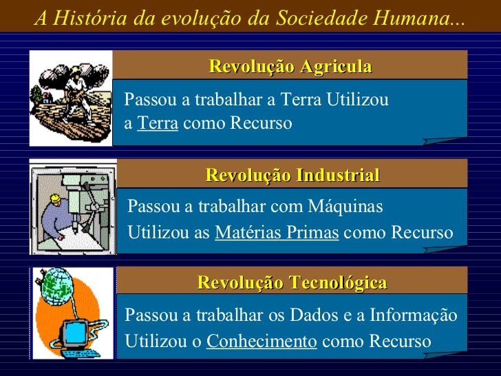2. 2. Passou a trabalhar a Terra Utilizou a Terra como Recurso Passou a trabalhar com Máquinas Utilizou as Matérias Primas como Recurso Passou a trabalhar os Dados e a Informação Utilizou o Conhecimento como Recurso A História da evolução da Sociedade Humana... Revolução Agricula Revolução Industrial Revolução Tecnológica
