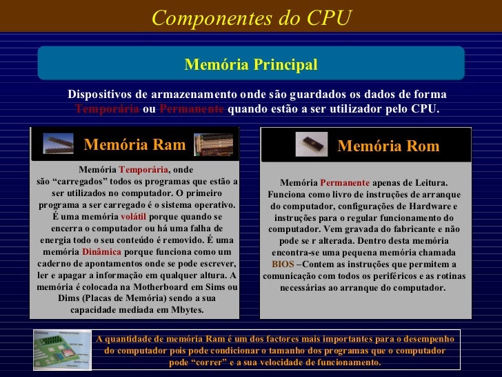 20. 20. Componentes do CPU Memória Principal Dispositivos de armazenamento onde são guardados os dados de forma Temporária ou Permanente quando estão a ser utilizador pelo CPU. A quantidade de memória Ram é um dos factores mais importantes para o desempenho do computador pois pode condicionar o tamanho dos programas que o computador pode “correr” e a sua velocidade de funcionamento. Memória Ram Memória Temporária , onde são “carregados” todos os programas que estão a ser utilizados no computador. O primeiro programa a ser carregado é o sistema operativo. É uma memória volátil porque quando se encerra o computador ou há uma falha de energia todo o seu conteúdo é removido. É uma memória Dinâmica porque funciona como um caderno de apontamentos onde se pode escrever, ler e apagar a informação em qualquer altura. A memória é colocada na Motherboard em Sims ou Dims (Placas de Memória) sendo a sua capacidade mediada em Mbytes. Memória Rom Memória Permanente apenas de Leitura. Funciona como livro de instruções de arranque do computador, configurações de Hardware e instruções para o regular funcionamento do computador. Vem gravada do fabricante e não pode se r alterada. Dentro desta memória encontra-se uma pequena memória chamada BIOS –Contem as instruções que permitem a comunicação com todos os periféricos e as rotinas necessárias ao arranque do computador.