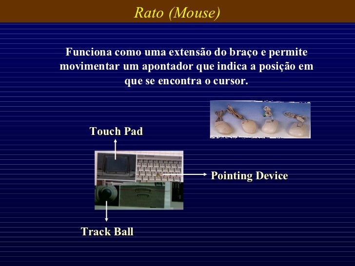 22. 22. Rato (Mouse) Funciona como uma extensão do braço e permite movimentar um apontador que indica a posição em que se encontra o cursor. Pointing Device Track Ball Touch Pad
