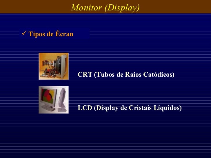 25. 25. Monitor (Display) CRT ( T ubos de R aios C atódicos) LCD ( D isplay de C ristais L íquidos) <ul><li>Tipos de Écran </li></ul>