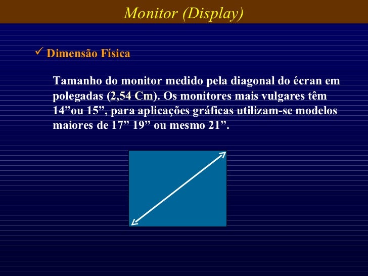 26. 26. Tamanho do monitor medido pela diagonal do écran em polegadas ( 2,54 Cm ). Os monitores mais vulgares têm 14”ou 15”, para aplicações gráficas utilizam-se modelos maiores de 17” 19” ou mesmo 21”. Monitor (Display) <ul><li>Dimensão Física </li></ul>