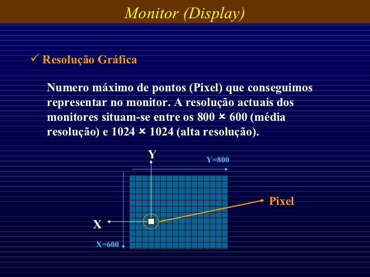 27. 27. Numero máximo de pontos ( Pixel ) que conseguimos representar no monitor. A resolução actuais dos monitores situam-se entre os 800  600 (média resolução) e 1024  1024 (alta resolução). <ul><li>Resolução Gráfica </li></ul>Monitor (Display) X Y Pixel Y=800 X=600
